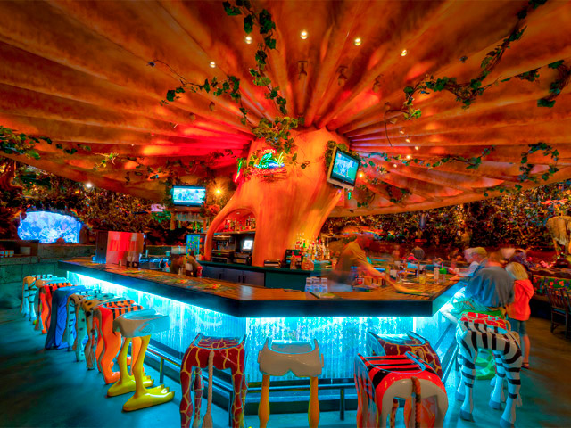 Antes de entrar en las puertas de Animal Kingdom, usted verá un gran edificio con una cascada de agua, dentro de esta estructura impresionante se encuentra el Rainforest Café, al cual puede entrar desde dentro o desde fuera del parque y donde realizar una divertida cena en este famosos restaurante.